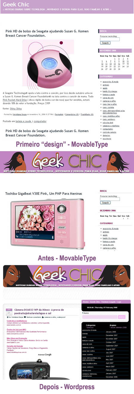 Nos últimos dias o Geek Chic não foi atualizado pois estavamos fazendo a mudança de plataforma, mudamos de Movable Type para WordPress e com isso reformulamos o layout.
