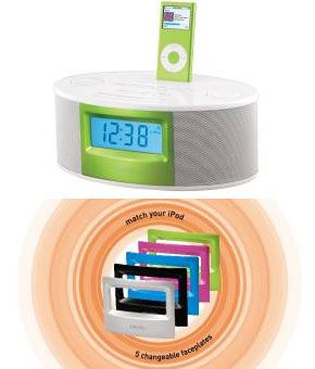 , 6 sons da natureza para você relaxar ao escutar, entrada para iPod/MP3/CD player, além de te dar a opção de mudar o faceplate para combinar com o seu iPod ou MP3 player. Preço: USD$59,99 (iSoundSpa Fusion) e USD$5,00 (cada faceplate).