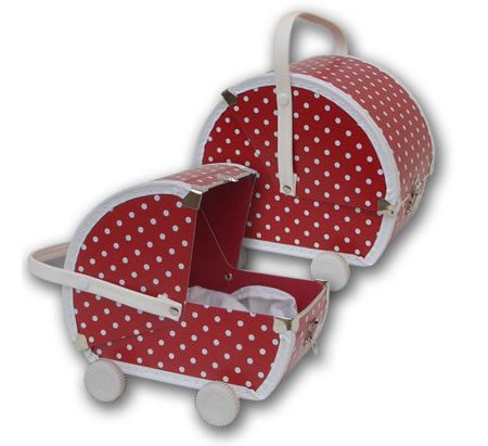 A valise com formato de carrinho de bebê é projetada para que as meninas pequenas carreguem suas coisas ou levem suas bonecas para passear. Disponível na cor acima, possui as laterais de metal. Preço: 30€