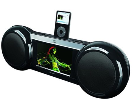 O dock para iPod Goodmans é um boombox com controle remoto, leitor de cartão (3 in 1), display LCD de 7 polegadas. No centro do dock os vídeos e fotos são exibidos. Preço: £89,99.