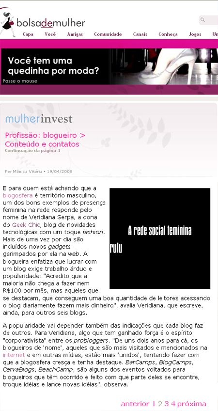 Semana passada o Nick Ellis perguntou se eu gostaria de responder algumas perguntas da jornalista Mônica Vitória do Bolsa de Mulher, e no dia 19/04/2008 foi ao ar a matéria “Profissão: blogueiro – Tem gente que vive de blog. Duvida? Veja o que eles dizem…”