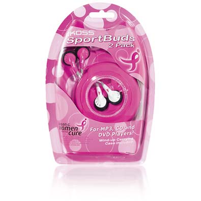 O Koss tem um par especial de earbuds Susan G. Komen StereoBudz, branco e cor-de-rosa dentro de um case. Uma parte do valor será doada a Susan G. Komen for the Cure (maior rede do mundo de sobreviventes de câncer de mama e ativistas) . Preço: USD$14,99.