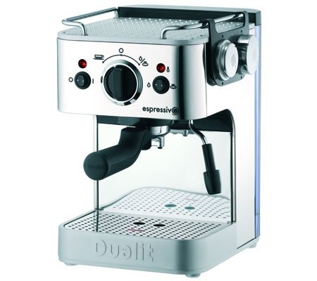 A máquina de espresso Dualit Espressive, é de cromo, fabricada na Inglaterra, inclue botões distintos com cantos arredondados. Preço: £149(USD$295).