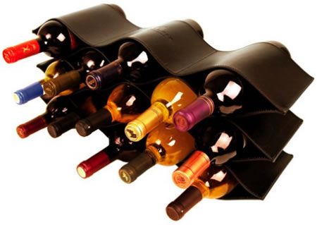 O suporte para vinhos da Trafalgar é todo feito em couro, podendo de ajustar aproximadamente dois a três garrafas em cada fileira, com capacidade total para armazenar treze garrafas. Disponível nas cores: marrom e preto. Preço: USD$295.