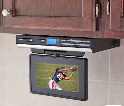 O Under Cabinet TV With DVD Player pode ser instalado sob qualquer gabinete (cozinha, escritório), você pode assistir TV ou DVDs além de escutar CD ou rádio AM/FM, utilizando um aparelho compacto. Com tela TFT LCD, formatosa widescreen ou standard (4:3), digital/análogo, capacidade de receber até 135 canais (cabo), funciona utilizando um AC. O controle remoto vem com imã para ser fixado ao refrigerador e funciona com duas pilhas tamanho AAA. Preço: USD$299,95.