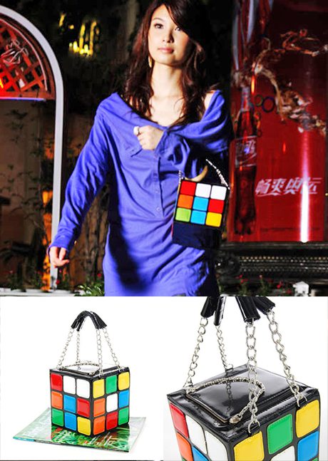 A Let’s Fly (China) lançou a bolsa inspirada no Cubo de Rubik, a “Rubik’s Cube Handbag”, feita com poliuretano e correntes metálicas, mede 15cm x 15cm x 15cm, a alça mede 12cm. Preço: USD$18. (Yes, Style)