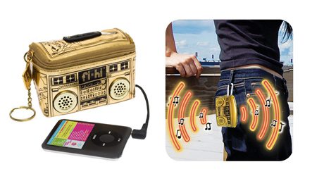 O Mini Boombox iPod Speaker Pouch da FredFlare tem o formato de uma mini bolsa metálicadourada e vem com um amplificador estéreo de 1400 milliwatt que pode ser conectado ao iPod ou qualquer MP3 player. Feito para ser usado preso ao cinto é resistente a água. Preço: USD$24