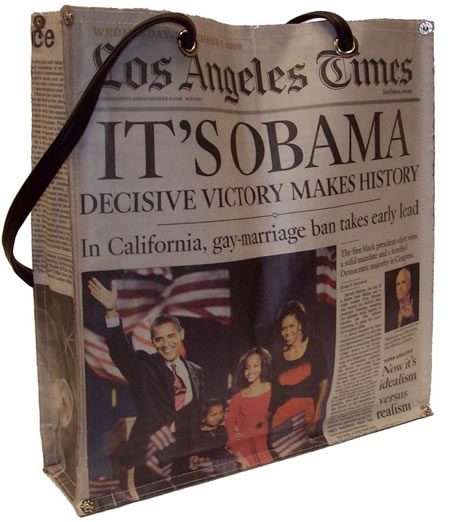 A edição limitada da bolsa Obama Newspaper (jornal de Obama) foi lançada para comemorar a eleição do novo Presidente americano. Preço: USD$75.