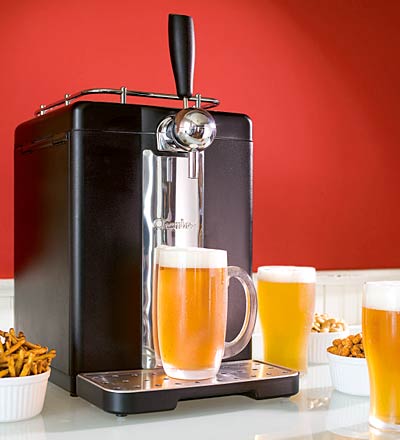 O Mini-keg dispensador de cerveja tem capacidade para 5 litros de cerveja, mantêm a bebida na temperatura ideal devido a camada dupla com isolamento e motor térmico elétrico. Uma luz que indica quando o dispensador está ligado ou desligado (on/off), possui bandeja removível e pés antiderrapantes. Preço: USD$249.95.