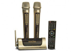 O aparelho de karaokê WOW Concerto 2009 Edition vem com 2070 músicas armazenadas, dois microfones sem fio, controle remoto e o usuário pode usar uma fonte própria de vídeo/dvd para exibir um background. Preço: USD$399.