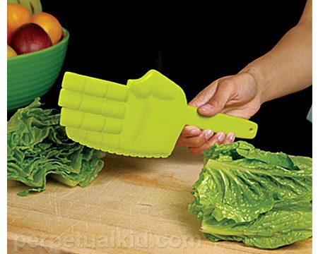 A faca Karate Chopper, é a mais nova arma contra os legumes e vegetais e é fabricada com material plástico e pode ser lavada na máquina de lavar louça. Disponível no site da Perpetual Kid por USD$11,99.