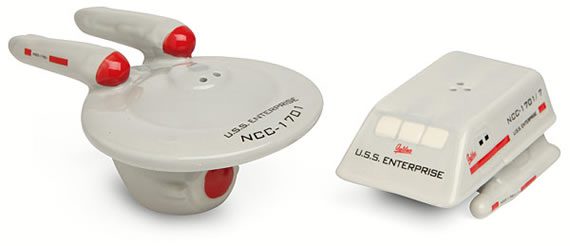 O conjunto de saleiro e pimenteiro da Star Trek Enterprise & Shuttle estão disponíveis no Think Geek por USD$12,99.