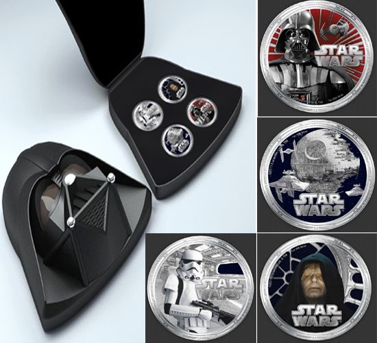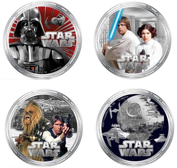 Darth Vader, Luke Skywalker, Yoda, entre outros personagens da saga Star Wars aparecem no conjunto de 40 moedas Star Wars feitas em Niue, uma ilha localizada no sul do Pacífico sul. As moedas valem 2 dólares da Nova Zelândia ou £1. Há também moedas de prata e o conjunto de quatro moedas custa £235.