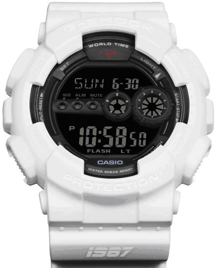 O relógio de pulso GD100NS-7 da Casio com assinatura de Nigel Sylvester,tem a pulseira branca, o fundo preto, é resistente ao choque e a à água em até 200m de profundidade.