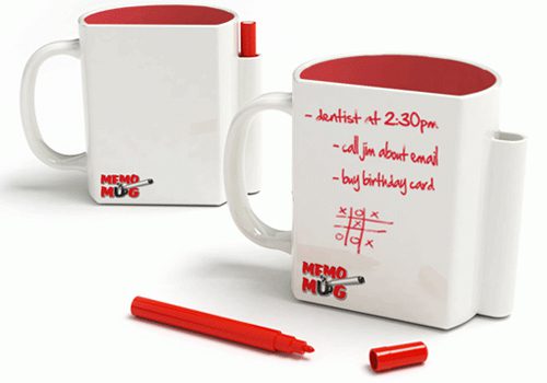 A caneca Memo Mug é feito de cerâmica, tem um lado liso para escrever e um local para armazenar a caneta apagável.