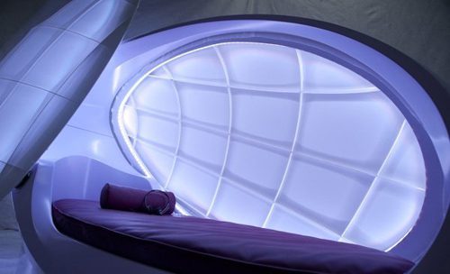 O Concoon by Wasserbetten é projetado com tecnologias inovadoras e apoiadas no conceito de bem-estar, é uma cápsula de bem-estar estilo futurista com o objetivo de distanciar o indivíduo das pressões do dia-a-dia, como se estivesse no útero, deitado em um colchão de água com sons relaxantes em um ambiente de cores, estando completamente isolada do mundo externo.