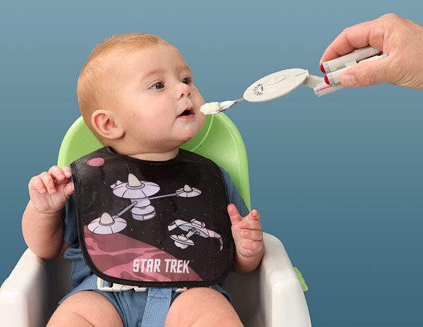O Star Trek Light-Up Feeding System, vem com uma colher acoplada em uma nave que é uma réplica da USS Enterprise NCC-1701, capitaneada por James T. Kirk, sensível a movimento, o babador do Star trek tem uma iluminação, o conjunto é ideal para crianças a partir de 12 meses de idade, tem como objetivo manter a atenção do bebê e tornar mais divertida a hora das refeições.