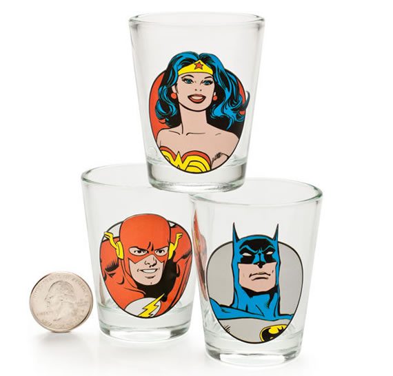 O conjunto de copos de shot da DC Comics disponível no ThinkGeek com os personagens: Super Homen, Batman, Mulher Maravilha, Arqueiro Verde, Flash e Lanterna Verde. Um conjunto de seis copos custa US$17,99.