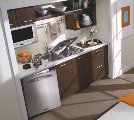 A opção SaniRinse™ aumenta a temperatura da água no enxágüe final, a 71°F. Um ciclo de 2 minutos de lavagem é útil para a limpeza de travessas ou utensílios de cozinha que você precisa para outras partes de uma receita e pode facilmente acomodar até cinco pratos, pode lavar até mesmo grande peças ou panelas e requer até 50% a menos de quantidade de água do que as máquinas de lavar louça de tamanho regular. Preço: USD$1795.