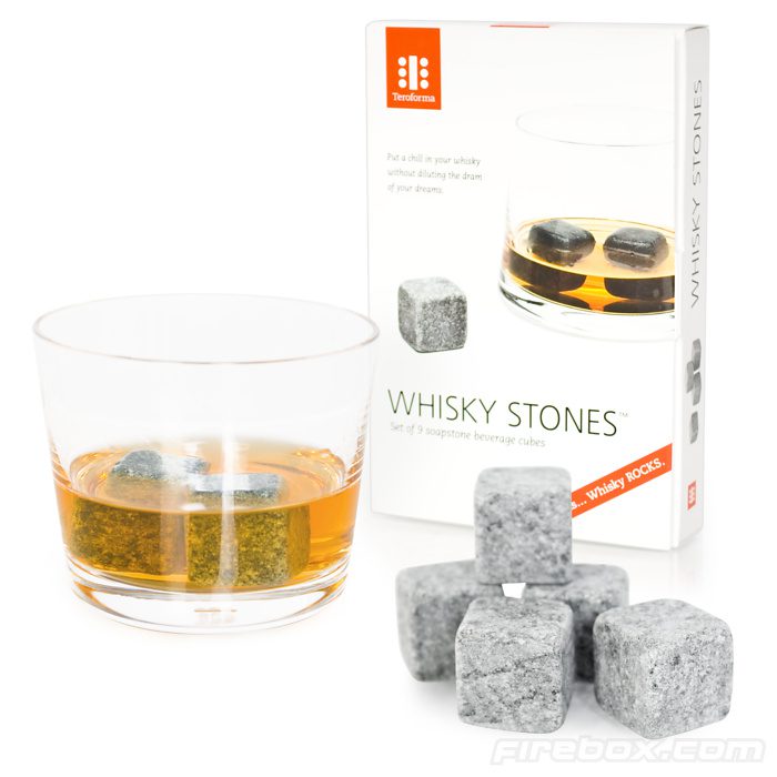 As Whisky Stones (cubo de pedra sabão) funcionam como ” cubos de gelo” na hora de gelar o seu whisky “on the rock” e estão disponíveis no Firebox por £17,99.