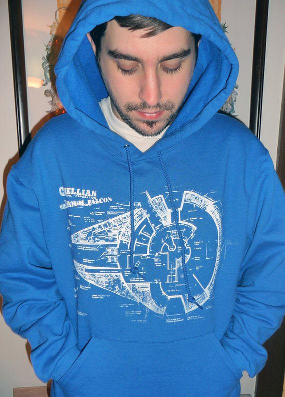 Os casacos de moletom com capuz da Millenium Falcon, impresso manualmente, feito 50% de algodão, 50% de poliéster, estava a venda na Etsy.