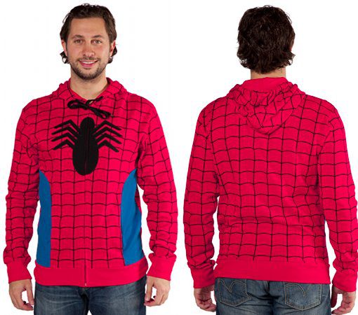 O casaco de moletom Homem Aranha, tem zíper, capuz, é fabricado com tecido 60% de algodão e 40% poliéster. Está disponível no site 8Ostees com preço promocional USD$29,99.