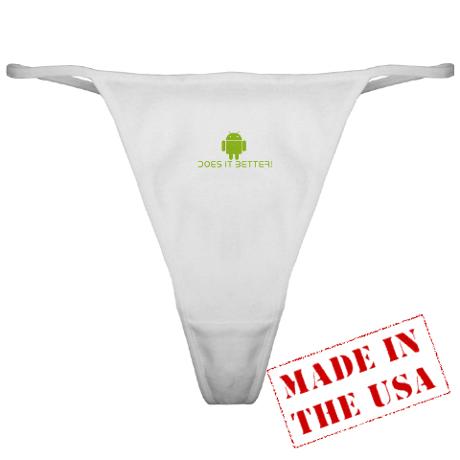 Para as meninas, a Thong Classic com cintura baixa, vem com a mensagem “Does it better”, 100% de algodão orgânico. Disponível no site Cafe Press por USD$ 12,50.