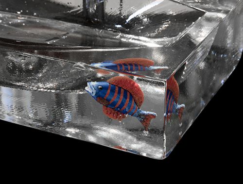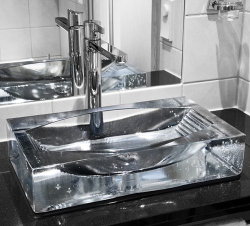 A pia Lagoon da linha de pias de vidro, da Kosta Boda, projetada pelo artista e designer Kjell Engman, é inspirada em um aquário na forma de bloco de gelo com um peixe congelado dentro 🙂