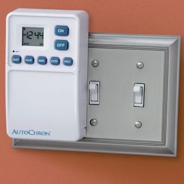 Com o Automatic Wall Switch Timer, é um Timer automático, você pode programar, por exemplo, quando irá desligar a luz, o ventilador … o aparelho se encaixa bem em cima do interruptor de luz e fisicamente move o interruptor para cima e para baixo, nenhuma fiação é necessária, funciona com um par de pilhas AA e tem a capacidade de ser programado para ligar ou desligar até 9 vezes por dia, além de ter comando manual. Disponível no Sky Mall por USD$34,99.