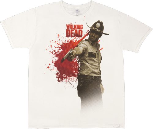 Esta camiseta Walking Dead com o personagem Rick Grimes apontando sua pistola para dar um tiro e matar um zumbi, é branca e feito 100% de algodão. Disponível no site 8Ostees por USD$24.