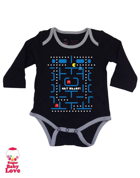 Os bodies com os designs do clássico Game Boy e do Pac-Man são 100% de algodão com estampas em silk. Disponível na Etsy por USD$17 cada.