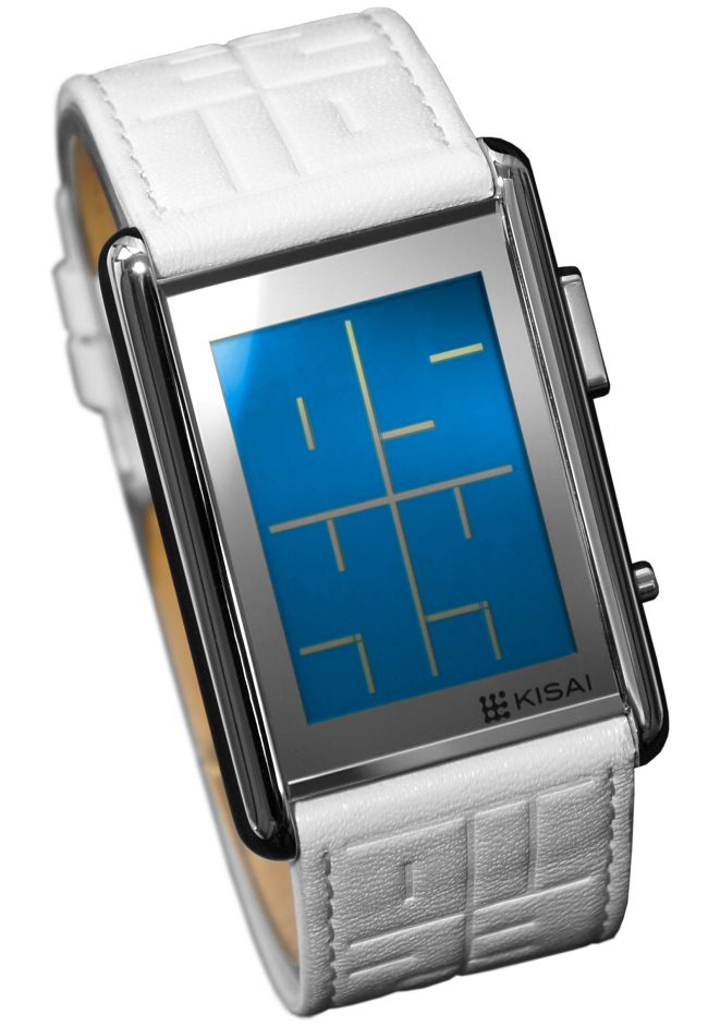 O relógio Kisai Stencil da Tokyoflash, baseado em um conceito projetado por um fan, usa o espaço negativo na tela LCD para mostrar a hora com números grandes no estilo a la grafite em um conjunto de quatro quadrados.