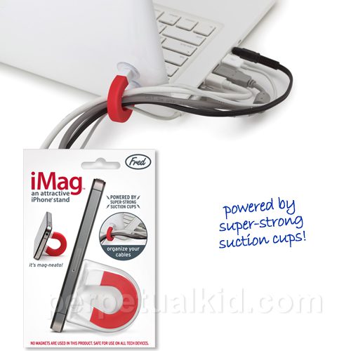 O stand iMag para iPhone, parece magnético mas não é, é preso via sucção e pode ser usado para escorar o telefone ou manter os cabos/fios organizados. Disponível na Amazon por USD$8,45.
