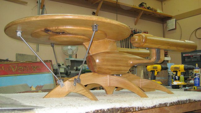 A mesa de centro no formato da Star Trek Enterprise, design de Barry Shields, foi construída feita de madeira (álamo e cerejeira) e a tampa é de vidro. Disponível na Etsy por USD$3100.