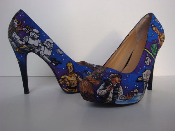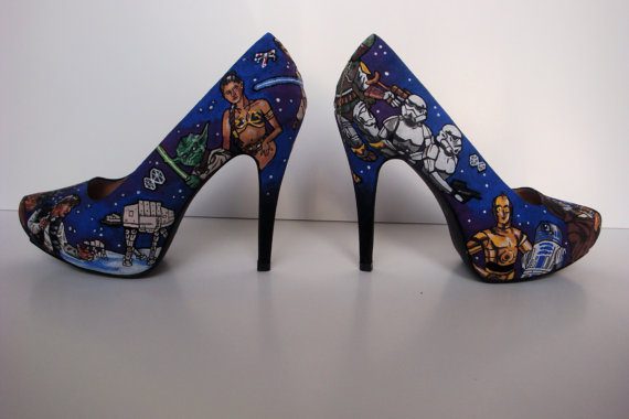 Holly Grothues criou salto alto Star Wars de vários modelos, pintados à mão, disponíveis sob encomenda na sua loja Etsy por USD$85. Holly trabalha com sapatos de todas as variedades, incluindo saltos, Converse, entre outros e pinta diversos temas de filmes, animes e jogos, além de também oferecer personalização. Visite a sua loja na Etsy.