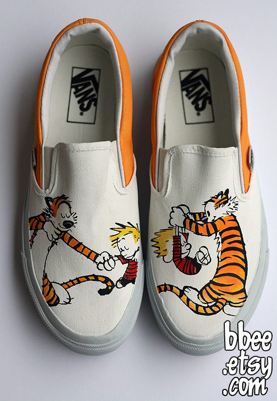 Alexandra Trim da bbee shoes pintou esse par de tênis, sob encomenda, o tênis do Calvin e do Haroldo, seus tênis são um sucesso absoluto, por esse motivo a artista no momento nem mesmo está podendo aceitar encomendas, sua loja na Etsy tem um recado informando que só irá voltar a funcionar quando conseguir entregar todas as suas encomendas.