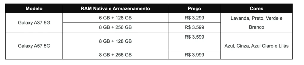 O Galaxy A57 5G está disponível em modelos de 256 GB e 512 GB de armazenamento, nas cores Azul, Cinza, Azul Claro e Lilás, com o preço sugerido a partir de R$ 3.599. O Galaxy A37 5G está disponível em modelos de 128 GB e 256 GB de armazenamento, nas cores Lavanda, Preto, Verde e Branco, com preço sugerido a partir de R$ 3.299.