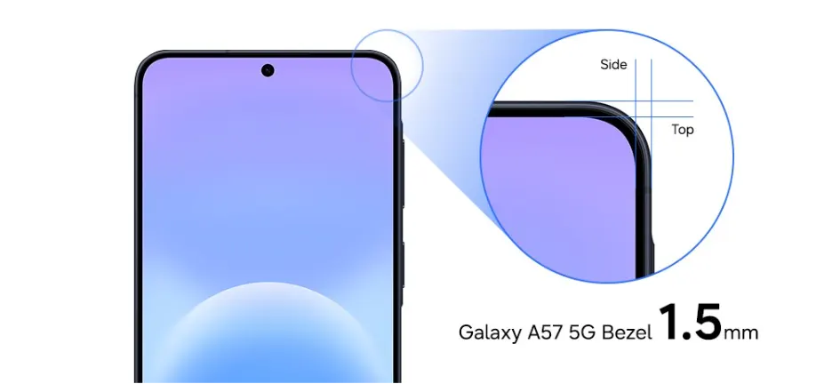 O Galaxy A57 5G possui bordas mais estreitas para uma experiência de visualização mais imersiva | Imagem meramente ilustrativa