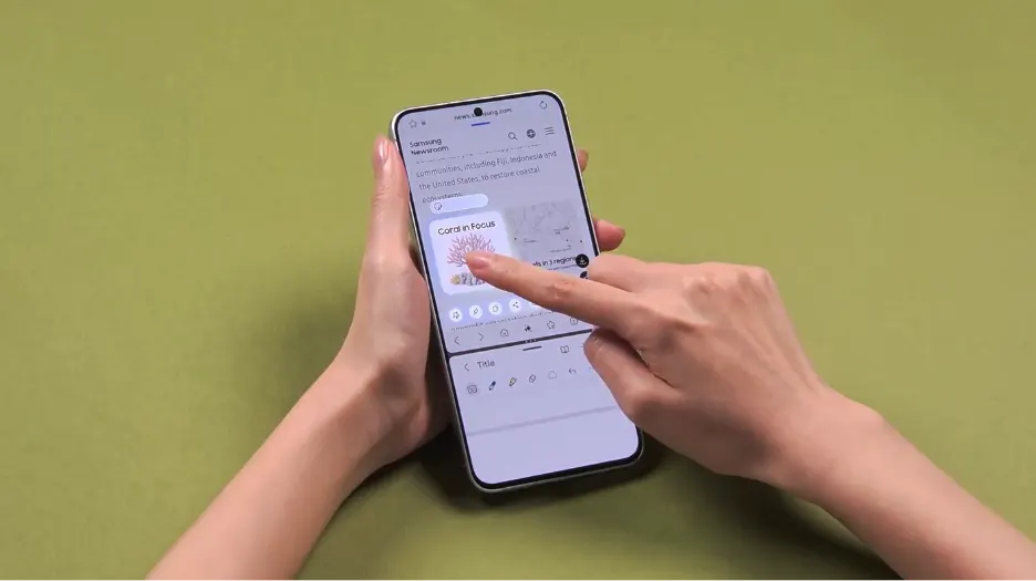 As pessoas também podem mover conteúdos perfeitamente entre os aplicativos. O Arrastar e soltar em múltiplas janelas, aprimorado com Seleção AI, permite uma execução mais rápida de várias tarefas em aplicativos como o Samsung Internet e o Samsung Notes. Por exemplo, imagens podem ser arrastadas diretamente para o Samsung Notes e redimensionadas conforme a necessidade.