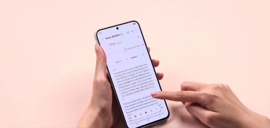 Uma das adições mais notáveis é a Transcrição de Voz, disponível na linha Galaxy A pela primeira vez. Com o aplicativo Gravador de Voz, é possível gravar áudio, converter fala em texto e traduzi-la para vários idiomas, facilitando a revisão de reuniões, a retomada de aulas ou a organização de chamadas gravadas.
