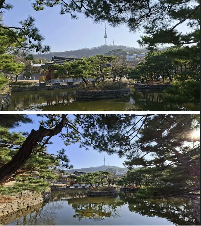 (De cima para baixo) Cena noturna em Seul com Nightography no Galaxy A57 5G
